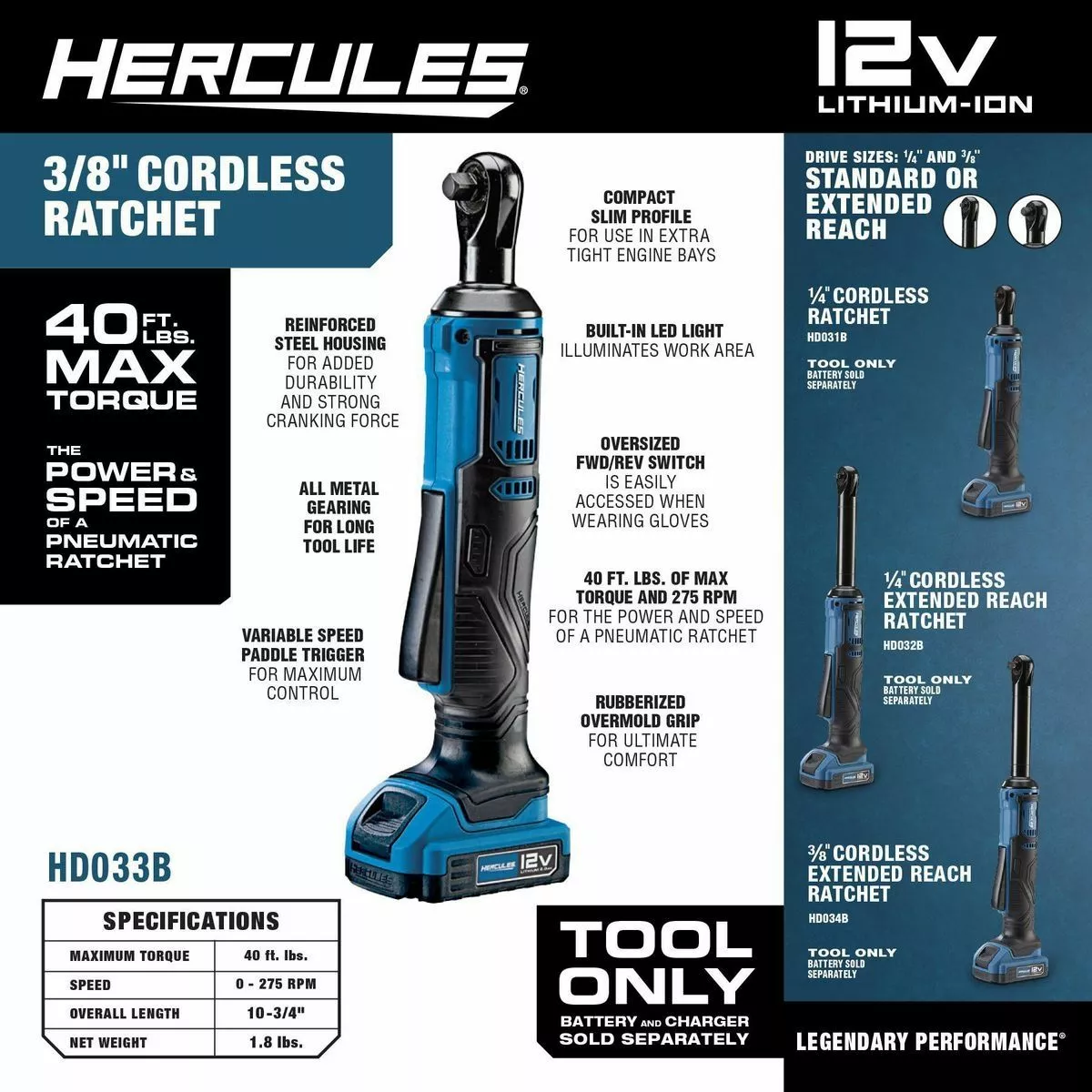 The HERCULESβ’ 12V Cordless 3/8 in. Ratchet delivers the power and speed of a pneumatic ratchet. The high power motor delivers 40 ft. lbs. of max torque at speeds of 275 RPM to remove the most stubborn fasteners. Pair up with the HERCULESβ’ 2.0 Amp Hour battery pack to deliver more work per charge and more work over the life of the pack. Buy with confidence, with an included no-questions-asked risk-free trial, extendable for up to 2 years.