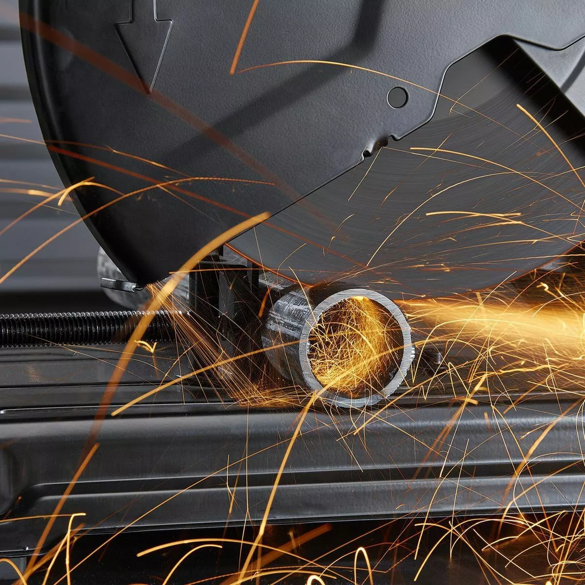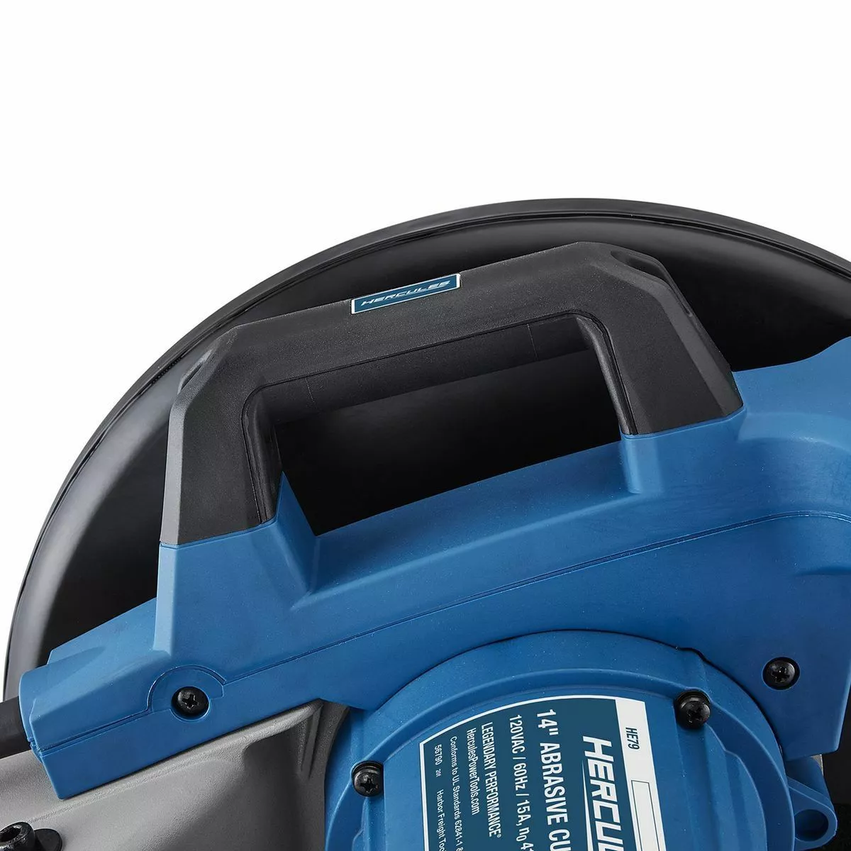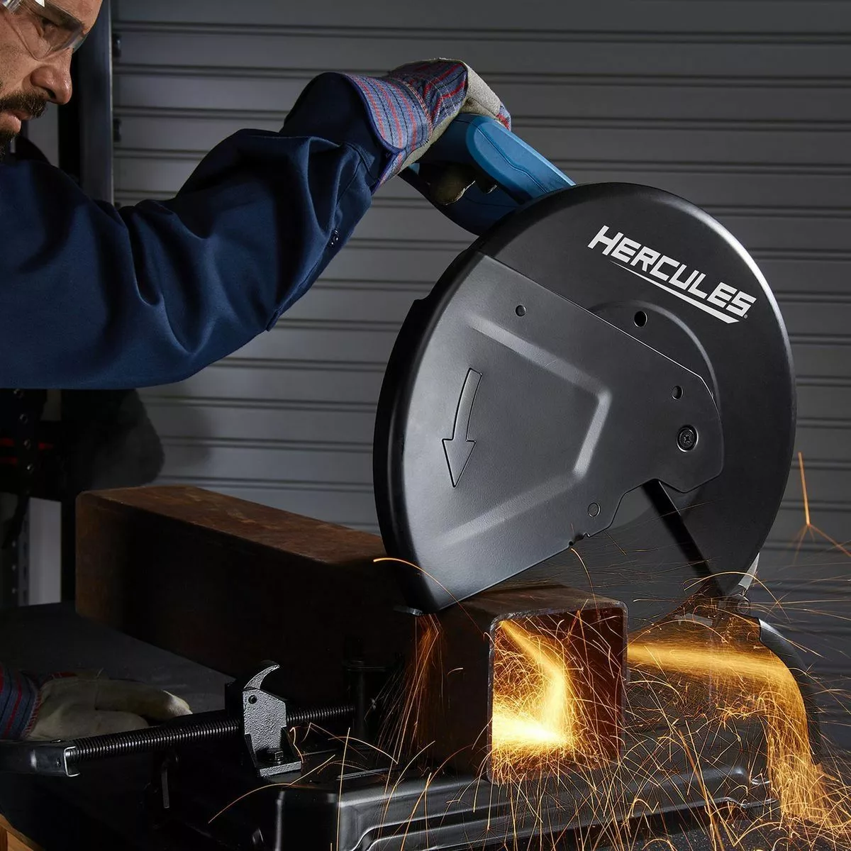 The HERCULESβ’ 14 in. Abrasive Cut-Off Saw features a high performance 15 amp, 4.3 HP motor to slice through metal with ease. Capable of cutting at speeds up to 4100 RPM, this saw cuts drywall track, angle iron, conduit, pipe, channels, tubing and rebar up to 5 in. thick. The quick-adjust vice, adjustable fence and depth stop produce accurate cuts every time. This saw offers ultimate jobsite versatility thanks to the compact, lightweight design combined with long reach 10 ft. 2 in. power cord. Experience minimal vibration and fatigue as a result of the ergonomic D-handle grip, heavy duty steel base, and rubberized no-mar feet. Additionally, this saw features an all-metal gear box with ball bearings for long life and extreme durability.