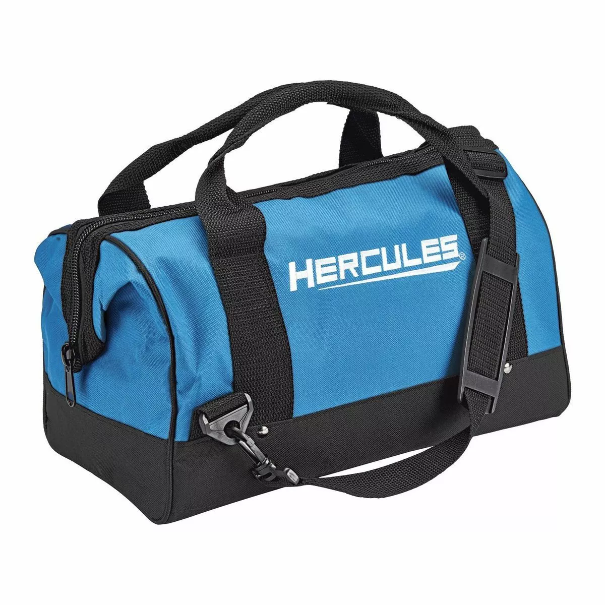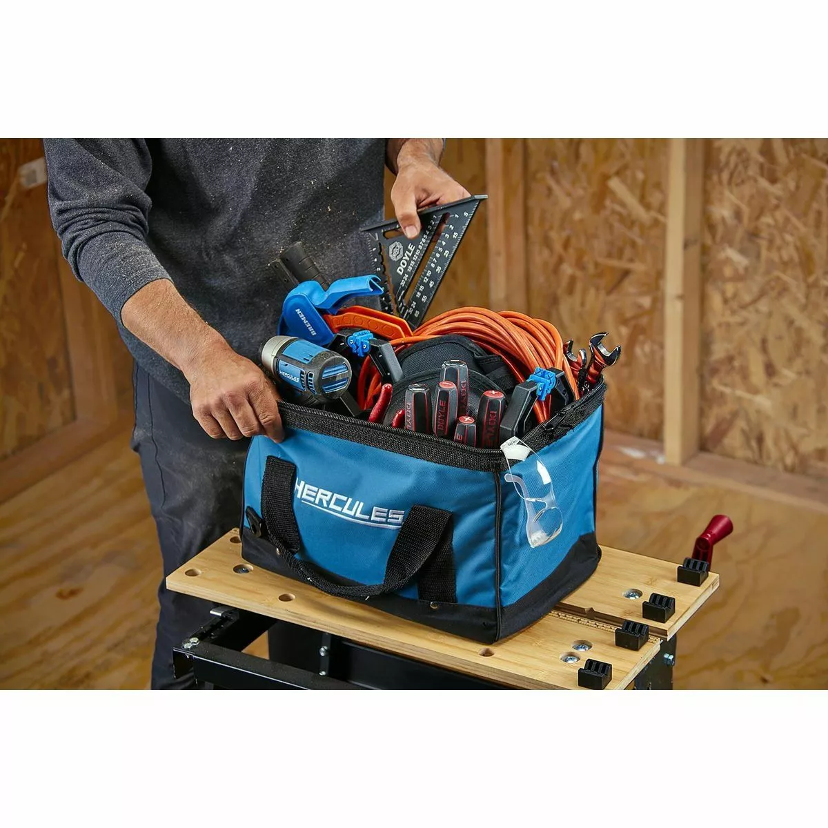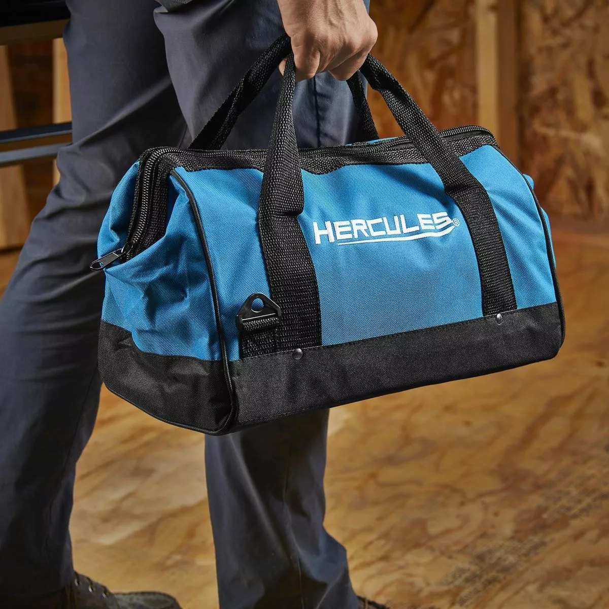 This wide mouth tool bag has 6 inside pockets big enough to hold bit kits, blade sets and batteries. The rugged shoulder strap makes the bag easy to carry with your hands free. The tool bag features an easy opening, 16 in. wide mouth and is constructed from super-tough tear resistant fabric.
