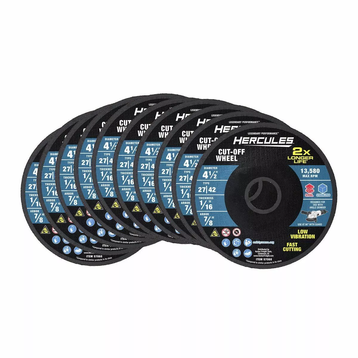 HERCULESโข cut-off wheels are constructed with premium abrasive grains and a high quality resin bond that delivers up to 2X longer life*. Ideal for use with a wide variety of metalworking cutting applications, these cut-off wheels are designed to deliver super fast, clean cuts. Designed for use with angle grinders using the proper safety guard.