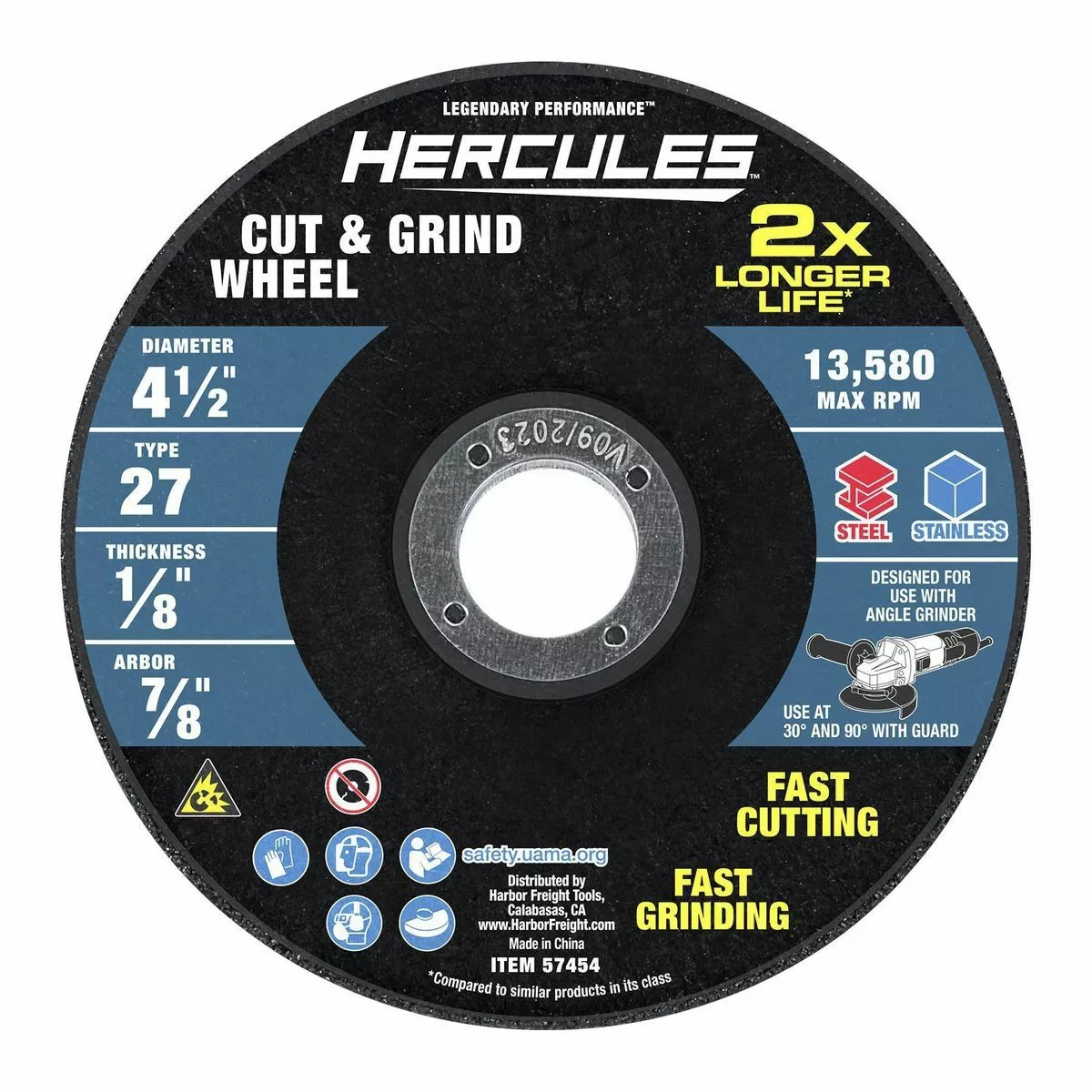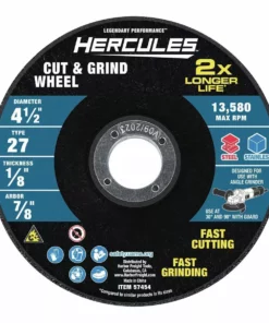 The HERCULESโข 4-1/2 in. Cut and Grind Wheel is superior in durability and performance. Ideal for use with a wide variety of metal grinding applications, this wheel uses premium quality abrasive for the toughest applications. Get the best results when cutting, grinding, smoothing, shaping metal, and removing weld slag.
