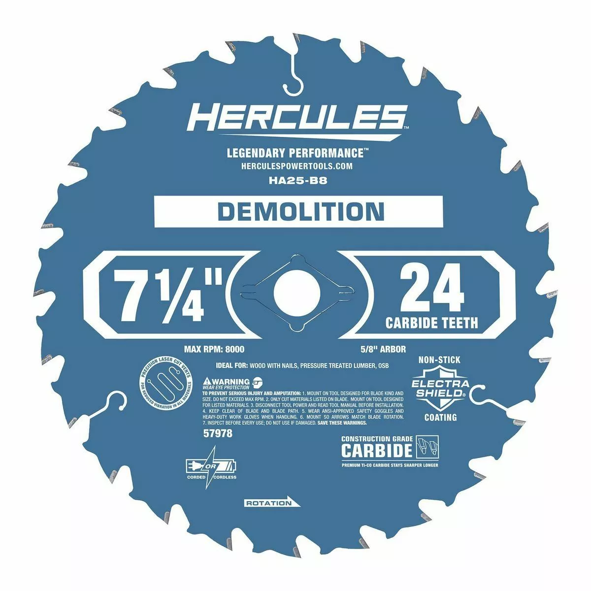 The HERCULES™ 7-1/4 in., 24T Demolition Miter and Circular Saw Blade delivers exceptional performance with full-blade Electra Shield® non-stick coating to prevent burning, sticking and gumming. The HERCULES™ circular saw blade is constructed with premium titanium-cobalt carbide cutting teeth, deeper gullets and anti-kickback design for long lasting performance.