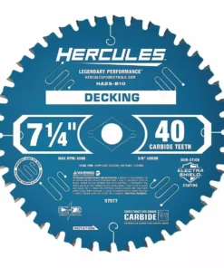 The HERCULES™ 7-1/4 in., 40T Decking Saw Blade cuts through composite and polyvinyl decking. Razor-sharp premium nickel-carbide cutting teeth stay sharper longer for exceptionally long blade life. The Electra Shield® non-stick coating prevents gumming and burning. Precision laser-cut expansion vents and vibration channels keep the blade straight and true.