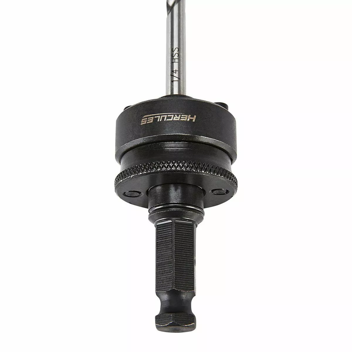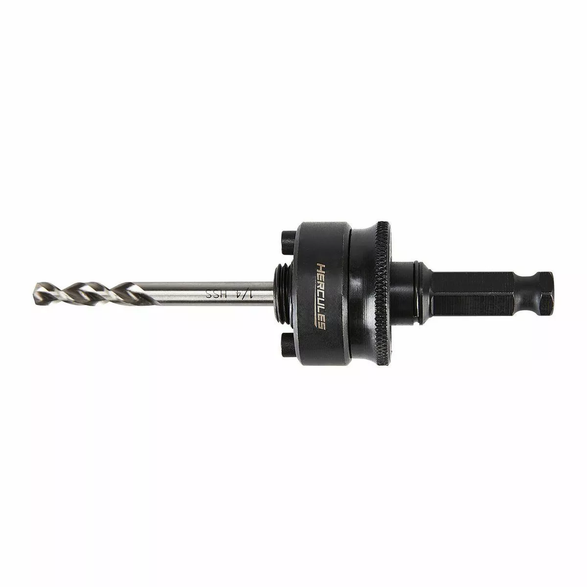 The HERCULESβ’ Hole Saw Arbor helps make quick and easy changes with HERCULESβ’ and other common hole saws. Designed to fit 1-1/4 in. and larger hole saws, this heavy-duty arbor is equipped with a 1/4 in. 135Β° pilot drill that easily starts holes in wood and metal. The no-slip 7/16 in. hex shank keeps arbor secure in high torque applications.