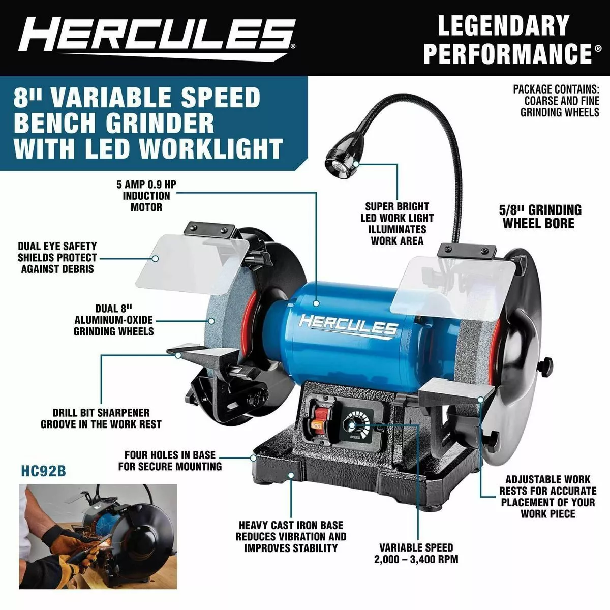The HERCULES 8 in. Bench Grinder is a powerhouse! The variable speed control is a game-changer, and the LED worklight is incredibly bright. Perfect for my workshop.