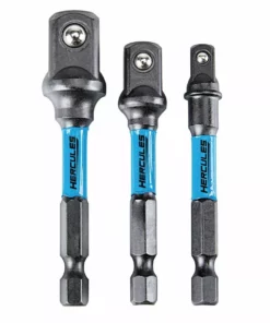 Heavy duty HERCULES™ Impact Rated Hex Shank Socket Drivers are designed with the TorqPoint™ Shock Absorbent Zone so that you can use your impact sockets with a standard drill/driver or impact driver. These adapters are constructed with advanced metallurgy to stand up to heavy use in impact tools. Quick change 1/4 in. hex shanks. Black oxide coating increases durability and prevents corrosion.